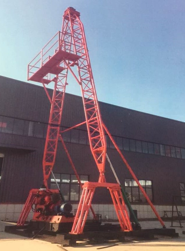 AY-13型鉆塔可配套各種水井鉆機和XY系列巖心鉆機垂直、斜孔的施工。其特點為設(shè)計除具有承載能力較大、結(jié)構(gòu)合理、液壓起塔安全可靠,拆裝、搬運成本低等特點外,最顯著特點一是塔腳跨度大(5米),操作鉆機空間大;二是塔身下塔腿連接鉸鏈高于底座底梁2.3米,從而在鉆機左右擺放時下塔腿不影響鉆機前后移車,鉆機動力部分可移至腿支撐內(nèi)襠中。也使得斜孔鉆進和提鉆過程中天車、回轉(zhuǎn)、井孔達到三點一線,大大提高了定向井孔施工的精準度及安全。
